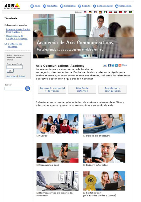 El Programa Axis Communications’ Academy es sólo una de las acciones de formación que la compañía ofrece a sus socios de ventas y desarrollo. Se complementa con otros cursos a través de Internet, seminarios web, así como con información online, tutoriales y un completo conjunto de herramientas que se ofrecen como ayuda para el diseño, el desarrollo y la implantación de sistemas de vídeo IP avanzados.