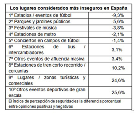 Según este estudio, el 70 por ciento de los españoles considera que la seguridad en los estadios de fútbol es mala o muy mala. En este sentido, la inseguridad percibida en estos lugares es la mayor de todos los analizados (lugares públicos, de transportes, de ocio, zonas turísticas o eventos masivos de cualquier tipo), seguida de la percibida en los parques y jardines públicos (28,7 por ciento). Esta percepción de inseguridad en los eventos futbolísticos también se coloca por encima de la de cualquier otro evento deportivo, como la Fórmula 1 (33,3 por ciento), los toros (32,8 por ciento), el baloncesto (32 por ciento) o el tenis (27,2 por ciento).