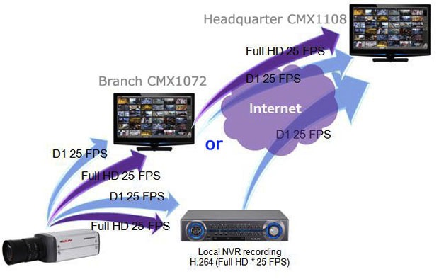 NAV1108 resulta especialmente indicado ipara la centralización en sede del sistema de control. Si el NVR se utiliza en una de las oficinas, éste puede transmitir vídeo vía Internet en resolución D1 al sistema de control de la oficina principal para su visualización.