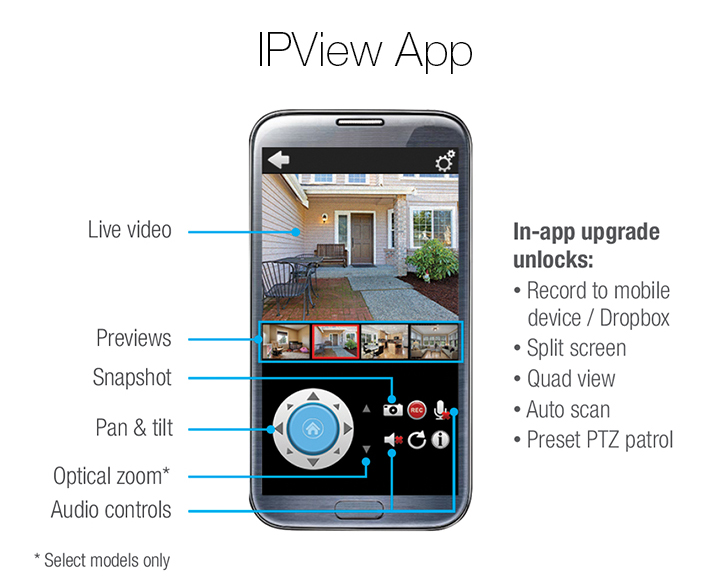 Los profesionales del sector de la seguridad pueden actualizar la app para acceder a funciones avanzadas como vigilancia predeterminada PTZ, pantallas divididas, visualización quad, autoexploración y almacenamiento de vídeo, y capturas de pantalla en Dropbox o localmente en el dispositivo móvil.