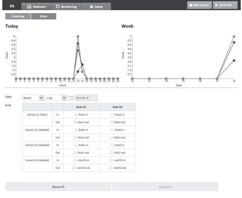 Con esta funcionalidad es posible realizar estadísticas y mostrarlas sobre zonas de ocupación, además de poder verificar la información sobre el recuento y zona, con vídeo en tiempo real. Los resultados se pueden descargar en un documento Excel o en archivo de texto, a través de FTP, y enviarse por correo electrónico de forma programada.