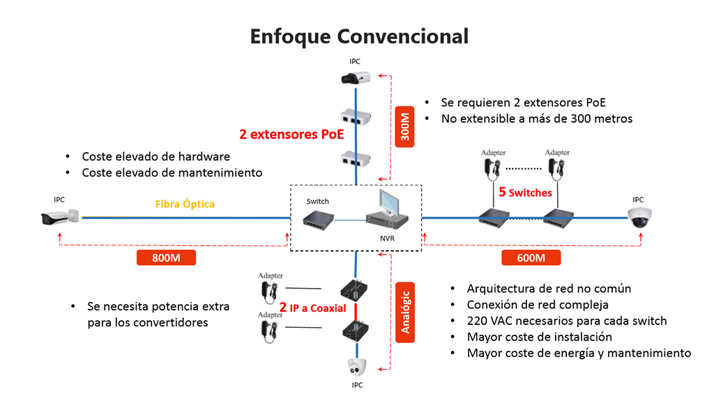 El sistema IP ePoE de Dahua presenta una configuración simplificada, con un interruptor ePoE especial y NVR. Los únicos aparatos satélite que se necesitan son el ePoE IPC en la parte final de un cable individual, unido a un convertidor EOC en ramificaciones analógicas.