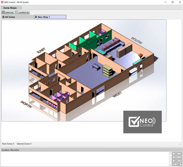 Fácil de instalar y configurar, NEO Control ofrece enrutado de audio de calidad; control de volúmenes; supervisión completa del sistema (fallos, modo evacuación, etc.) por zonas, y permite añadir el plano de la instalación, entre otras características. Un sistema NEO puede aceptar como máximo cinco conexiones desde NEO Control.