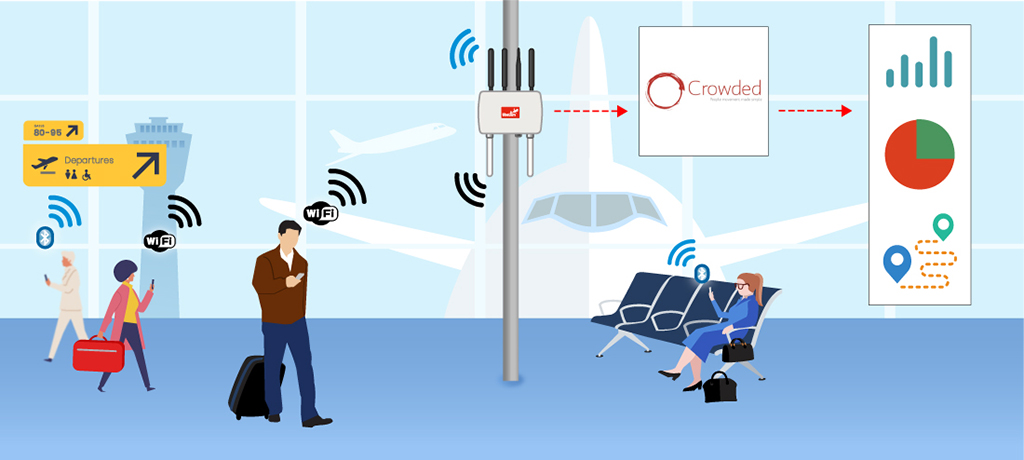 Se han instalado seis dispositivos Libelium Meshlium para monitorizar el movimiento y comportamiento de las personas dentro del aeropuerto. Esta información es enviada a la plataforma Crowded de Innotech Insights para analizar los datos.