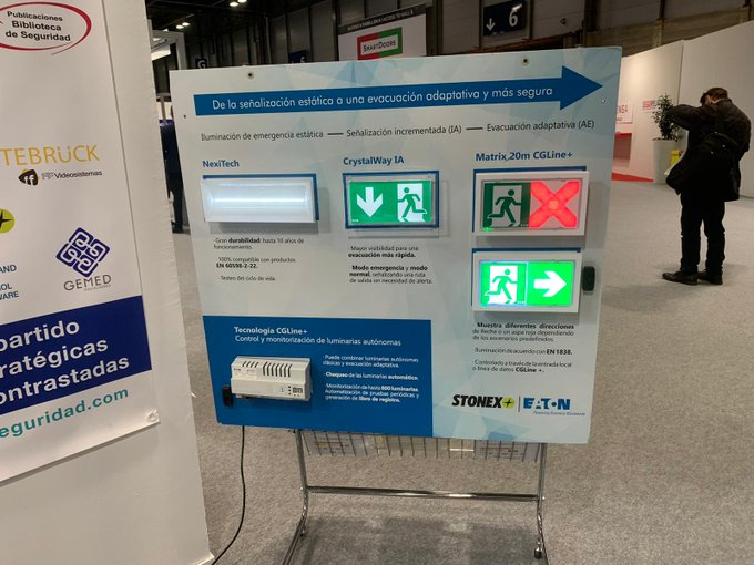 Stonex ha acudió al Salón Internacional de la Seguridad (SICUR 2020), en colaboración con GET (Grupo de Estudios Técnicos), que se encuentra en el stand 8E06, para mostrar la nueva tecnología de Iluminación Adaptativa de Emergencia desarrollada y patentada por Eaton y que está en línea con la regulación (EN 1838). Se trata de un sistema de iluminación de emergencia capaz de mostrar diferentes rutas de evacuación, según la situación lo requiera y mediante previa programación.