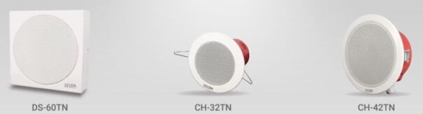 Entre la gama de altavoces certificados EN 54-24 se han renovado el altavoz de techo CH-42TN, con driver de 6” y cúpula metálica para proteger el circuito en caso de emergencia; el modelo de superficie de 5” DS-60TN, que puede montarse en techo y paredes y dispone de protección antivandálica y contra el fuego, así como el proyector acústico PCM-20TN, con driver de 5” en caja de aluminio con rejilla de acero para mayor durabilidad en exteriores, con soporte en U de inclinación regulable.