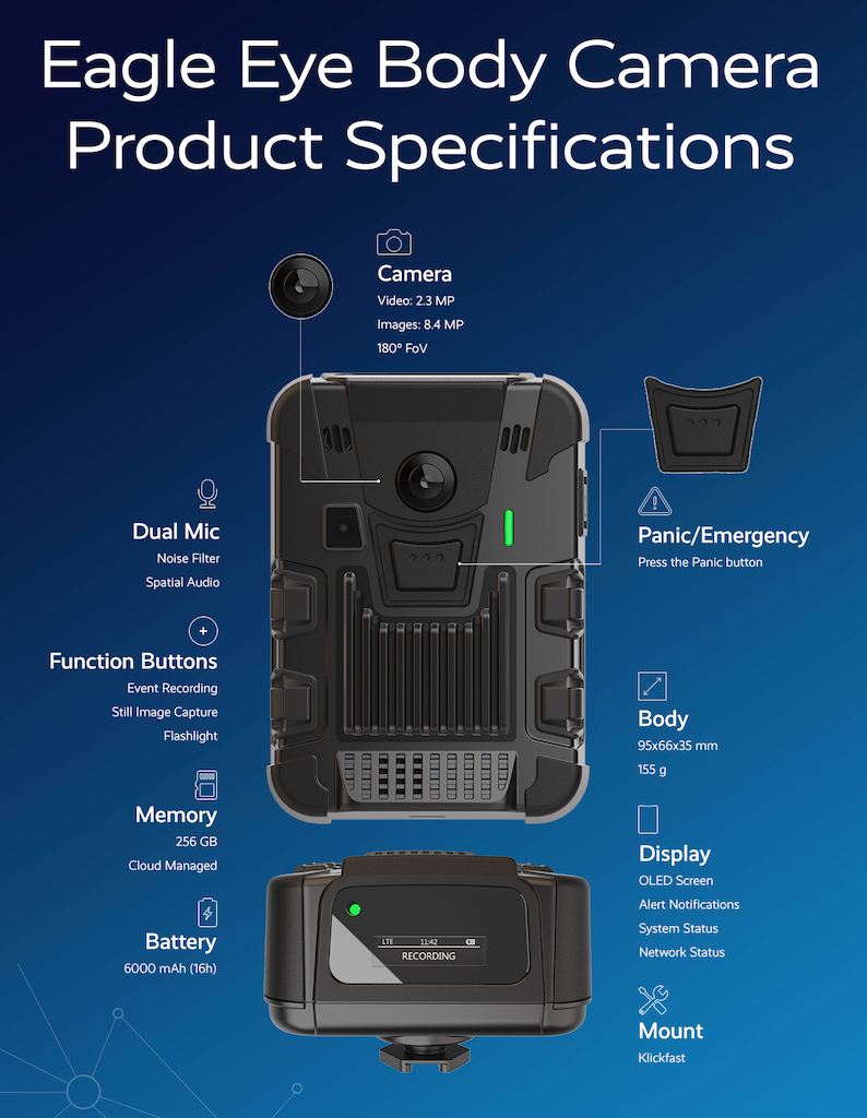 Estos dispositivos corporales están disponibles inicialmente en la plataforma CameraManager de Eagle Eye Networks, con disponibilidad en el sistema de gestión de vídeo en la nube (VMS) de Eagle Eye en 2022.