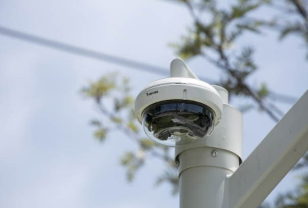 A las necesidades de vigilancia en exteriores se da respuesta con la cámara de red panorámica de 180° Vivotek CC9381-HV, que cuenta con iluminadores IR integrados de 180° de hasta 15 metros. Esto permite una cobertura de vigilancia completa 24/7, independientemente de las condiciones de luz o oscuridad durante el día o la noche.