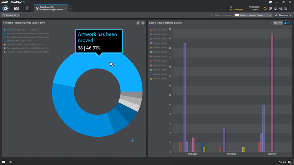 “La integración de Fortecho es el ejemplo de cómo se pueden integrar mensajes de alarma de aplicaciones de terceros en la plataforma de software Hemisphere con la ayuda de Apache ActiveMQ”, aclara Ep Smit, Senior Enterprise Solutions Manager de Dallmeier. “A través del dashboard interactivo del software Hemisphere, los usuarios en el sector de museos o arte pueden acceder con sólo tres clics de ratón o menos, a toda la información relacionada con cualquier incidente dentro de un periodo de tiempo determinado.”
