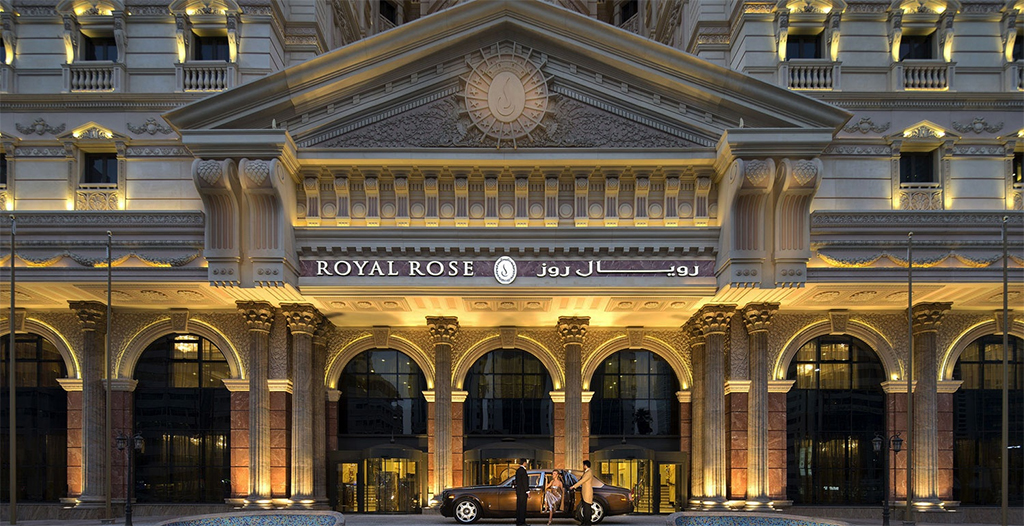 El Royal Rose es un lujoso hotel de 5 estrellas ubicado en el corazón de Abu Dabi. Su exterior simula la fachada de un palacio francés del siglo XVII, mientras que su interior es igual de opulento, con paredes cubiertas con intrincados diseños de pan de oro y acentuadas con candelabros ornamentados. El edificio se encuentra a poca distancia del centro de negocios, instituciones gubernamentales, centros comerciales y otras instalaciones de ocio. En total alberga 355 habitaciones repartidas en 17 plantas.