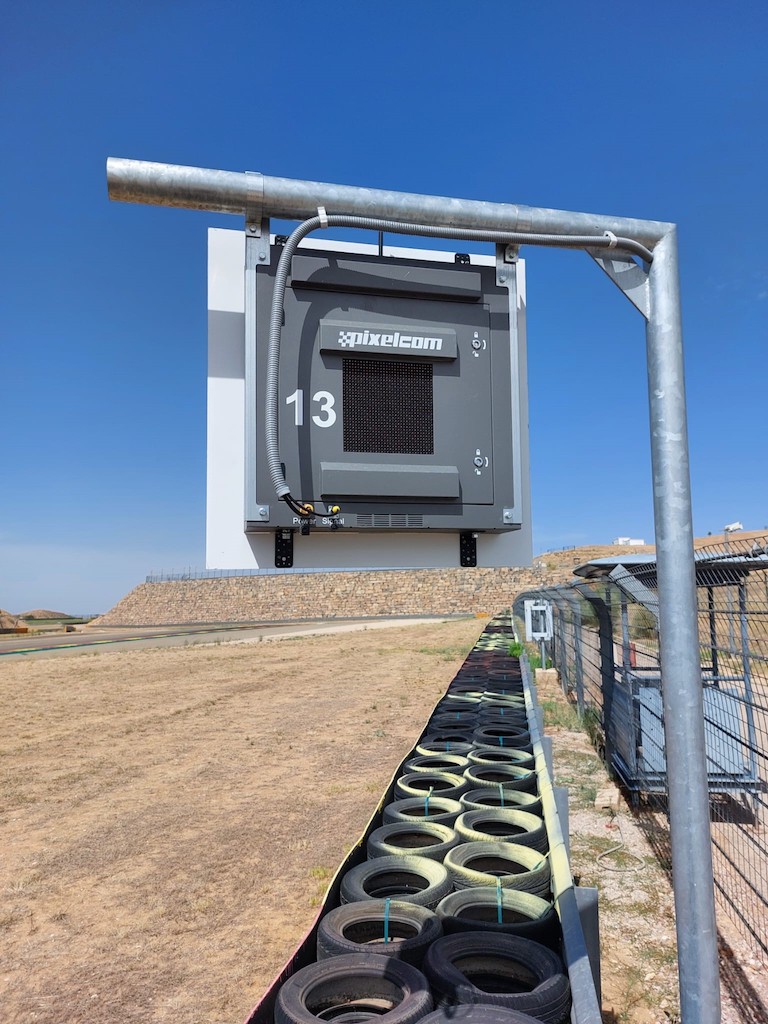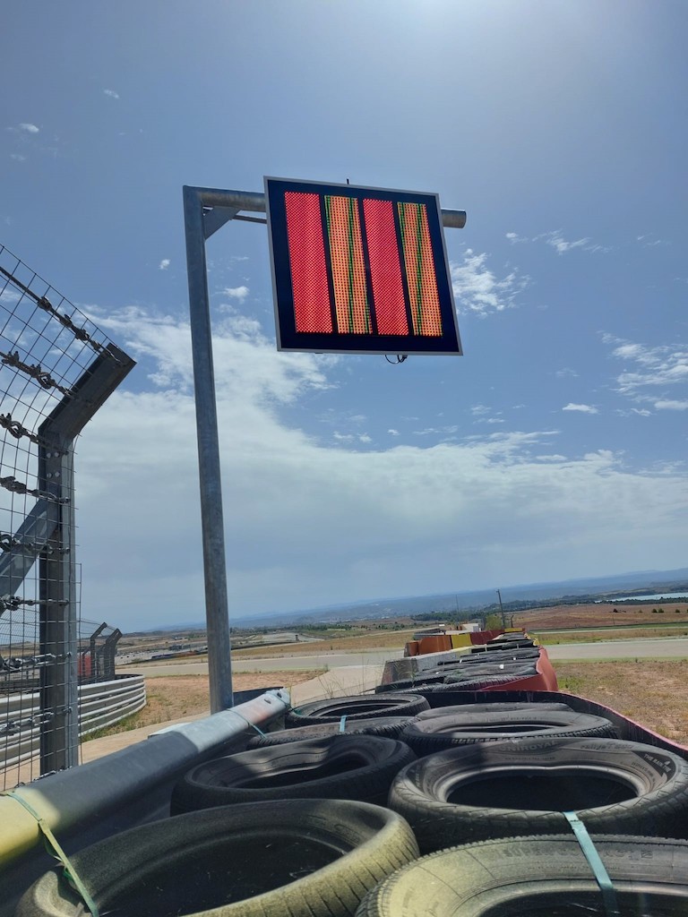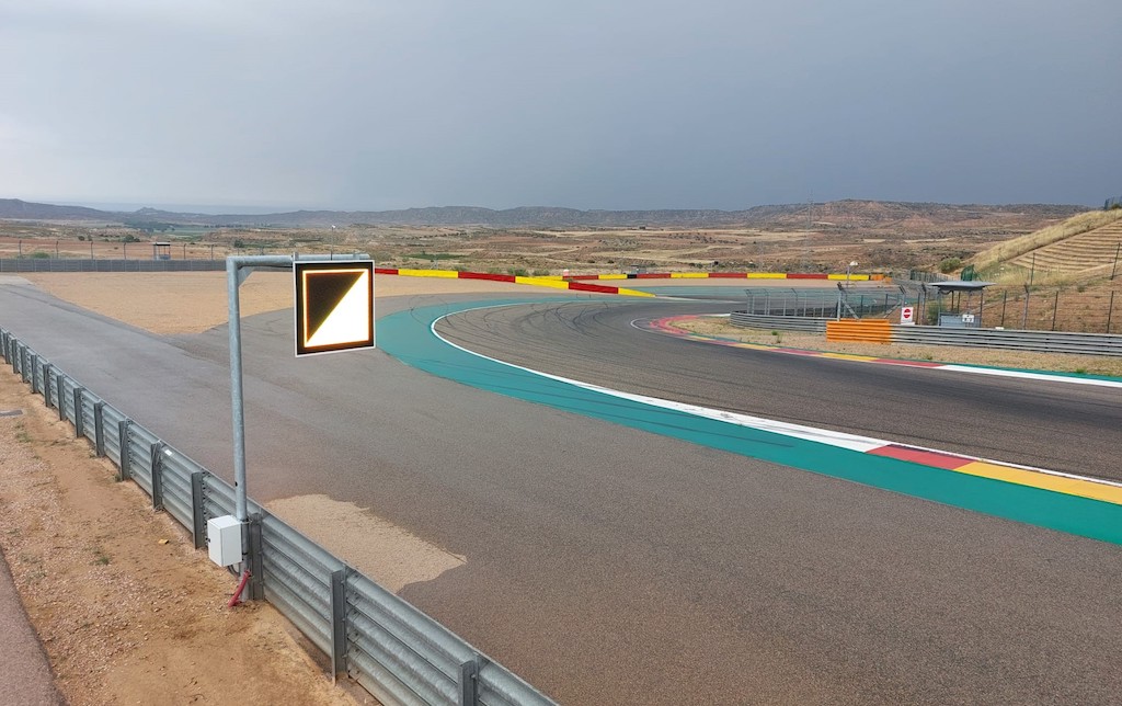 Un total de veintiún banderas digitales luminosas Led, homologadas por la FIA y la FIM, componen la nueva solución de seguridad en pista que Pixelcom ha instalado de forma permanente en el circuito de Alcañiz.