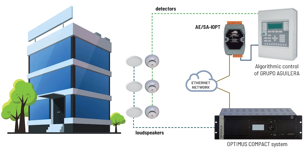 Esto se ha logrado con una integración de alto nivel (protocolo JSON) del sistema algorítmico de detección de incendios de Grupo Aguilera con el sistema de megafonía y alarma por voz Compact de Optimus.
