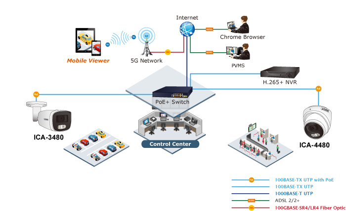 Alimentado desde un equipo de fuente de alimentación PoE, como un conmutador PoE 802.3af/at o un inyector PoE 802.3af/at a través de un cable de red, el ICA-4480, que adopta el estándar IEEE 802.3af/at, no necesita cables de alimentación ni mano de obra adicionales. Es compatible con ONVIF e interoperable con otras marcas del mercado.