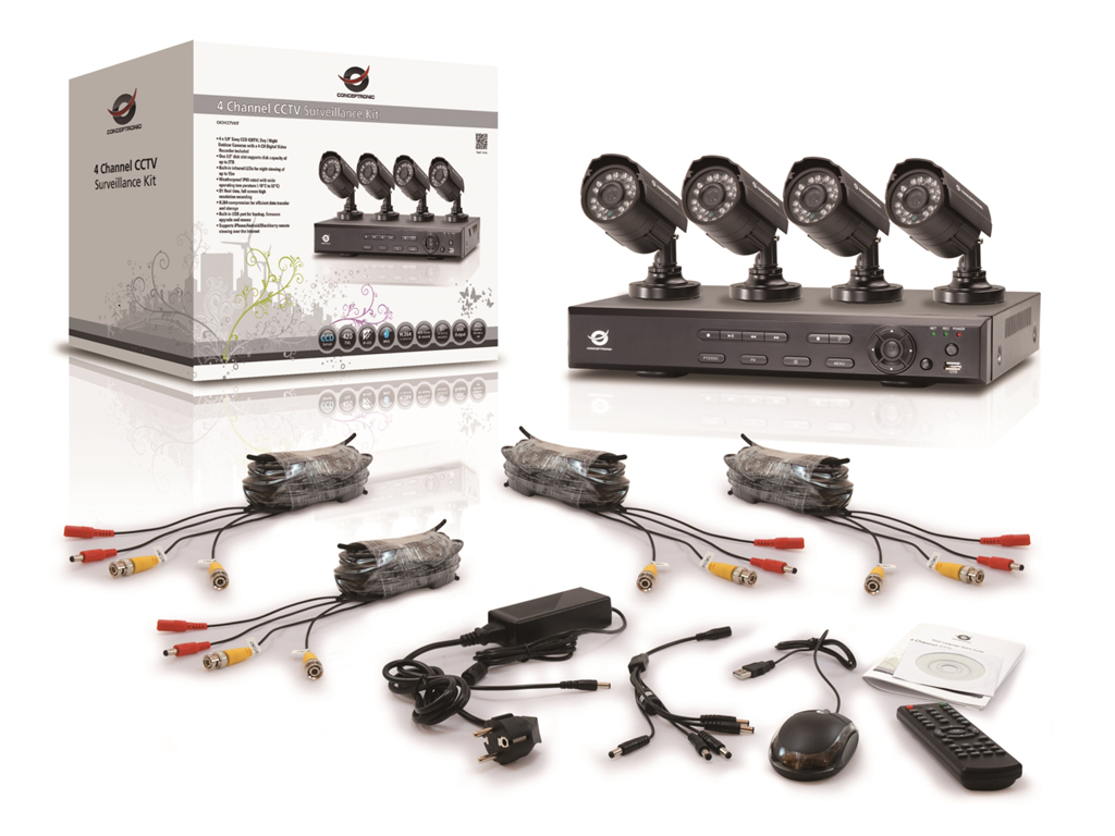 El kit de videovigilancia Conceptronic CTV está integrado por cuatro cámaras Sony CCD 420TVL y está pensado para instalar tanto exterior como en interior, permitiendo la monitorización en remoto incluso con visibilidad nocturna.