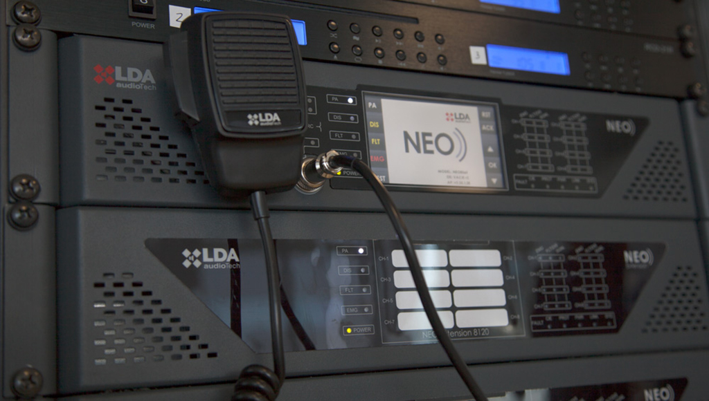 NEO proporciona un sistema de audio profesional con DSP integrado y salidas digitales de 24 bits por canal, con tecnología propia LDA Dynamic Sound Adjust que permite ajustar el volumen de manera dinámica para garantizar que el mensaje sea siempre claro e inteligible.