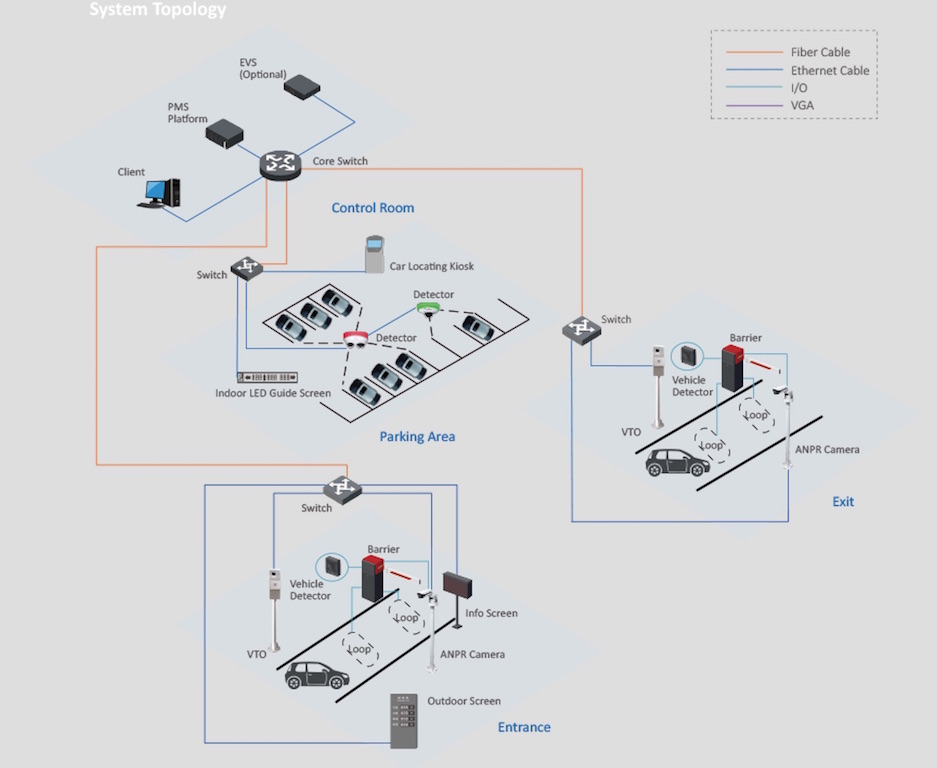 El diseño del sistema es muy simple: el centro de gestión está conectado a la entrada, salida y aparcamientos por un cable de fibra, siendo la ANPR, VTOs, pantallas de guía, barreras y cámaras conectadas por cables Ethernet.