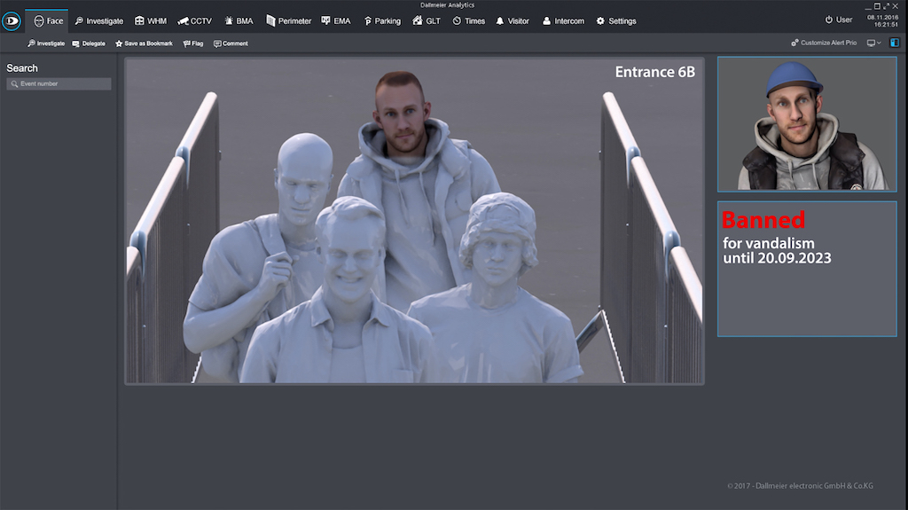 Consultas forenses, tales como el reconocimiento facial, pueden utilizarse para denegar, desde la zona de entrada, el acceso al estadio a visitantes que están en la ‘lista negra’, o comprobar a posteriori el paradero de personas de interés en la grabación de vídeo, For example, para investigar su participación en incidentes.