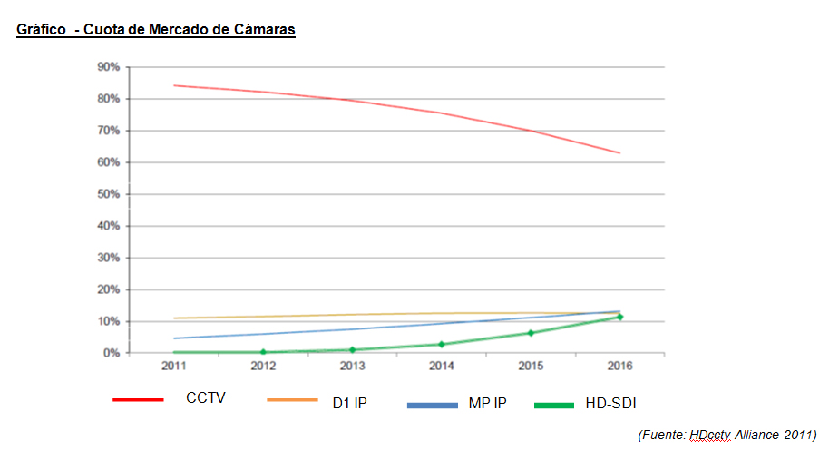 Según datos de la alianza HDcctv, según la previsión hasta el 2016 -como podemos ver representado en el gráfico- la cuota de mercado de cámaras analógicas se verá seriamente perjudicada con una pérdida de hasta un 20% de cuota de mercado en ventas y sin embargo nuevos productos como cámaras megapixel y cámaras HD-SDI crecen hasta un 10% de cuota de mercado. Las nuevas tecnologías megapixel ofrecen más resolución y calidad de imagen, por lo que tiende a crecer con fuerza en cuota de mercado y las convencionales, analógicas, pierden mercado a pasos muy rápidos.
