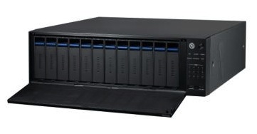 Los doce discos duros internos de este NVR, intercambiables en caliente, son compatibles con grabación RAID5 y RAID6, lo que ofrece protección frente a errores irrecuperables de escritura o ante una avería integral del disco duro. Este modelo cuenta también con una interfaz iSCSI para que los usuarios puedan acceder a dispositivos de almacenamiento de gran capacidad si es necesario.