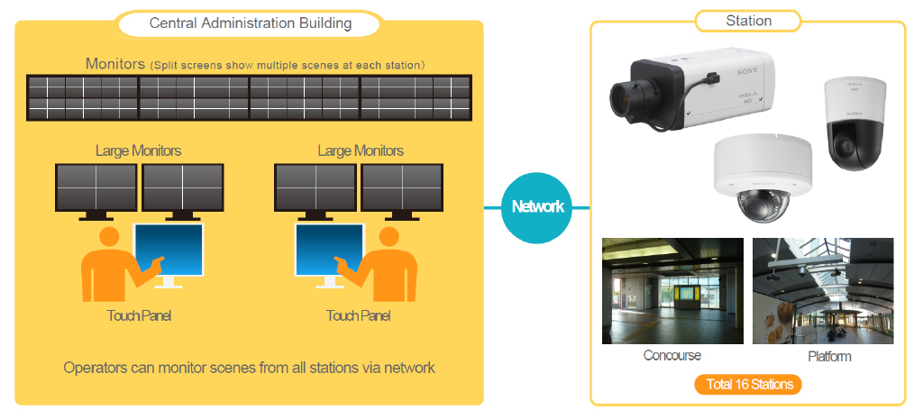 Ce projet, devrait être terminé en janvier 2016, aura plus de 200 Caméras réseau Sony HD à installer dans 16 Stations de la ligne Yurikamome. Tout sera contrôlé depuis une station de surveillance centrale personnalisée et construite par Sony..