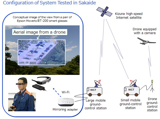 La información sobre localizaciones filmadas o fotografiadas se enviaría virtualmente en tiempo real usando la tecnología inalámbrica de NICT al equipo especializado en desastres que actúa sobre el terreno o en el propio lugar. A su vez, dichos datos se retransmitiríana unas Moverio BT-200 desde un adaptador inalámbrico ‘de espejo’.