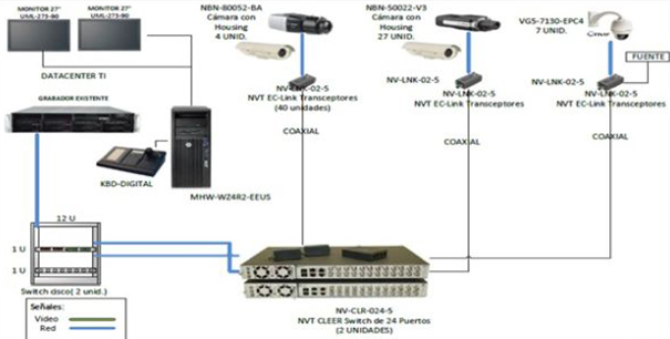 Para este proyecto se utilizaron dos equipos NV-CLR-024-5, veinte NV-LNK-02-5 y quince NV-EC-100-PWR. Estos sistemas de NVT Phybrigde tienen como principal función brindar el servicio de monitoreo y grabación de incidentes en el interior del centro comercial y su perímetro, permitiendo enlaces IP con alimentación PoE de hasta de 600 métros. Para la visualización de las imágenes se utilizan dos monitores de 32 pulgadas y para la grabación un Bosch DIP-7083-8HD.