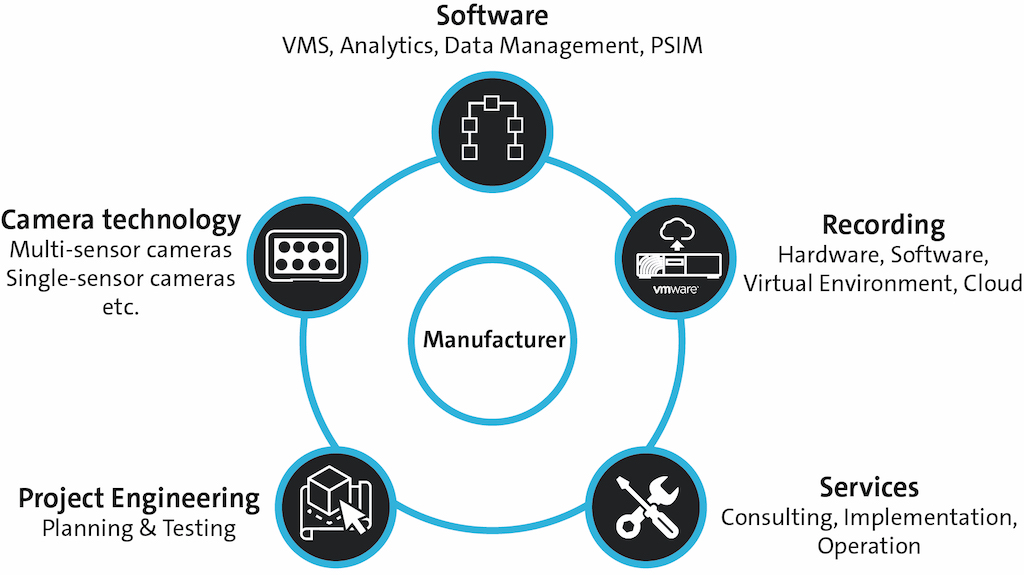 Utilizar todos los componentes de un fabricante también implica, en muchos casos, que los módulos técnicos individuales (cámara, grabación, plataforma de software, etc.) son totalmente compatibles y, posiblemente, hayan sido desarrollados juntos.