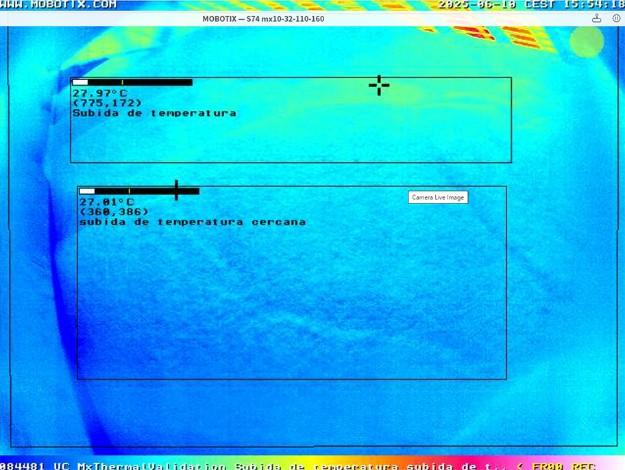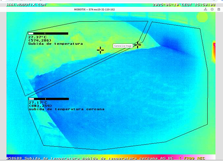 La instalación también incorporó la app de Validación Térmica desarrollada por Mobotix. Questo, integrada directamente en la cámara, actúa como filtro inteligente para reducir falsas alarmas, validando únicamente aquellas alertas térmicas que realmente representen un riesgo. Esto fue especialmente importante en esta instalación, ya que el constante movimiento de maquinaria y vehículos en la zona podría haber generado múltiples falsas alertas sin esta función.