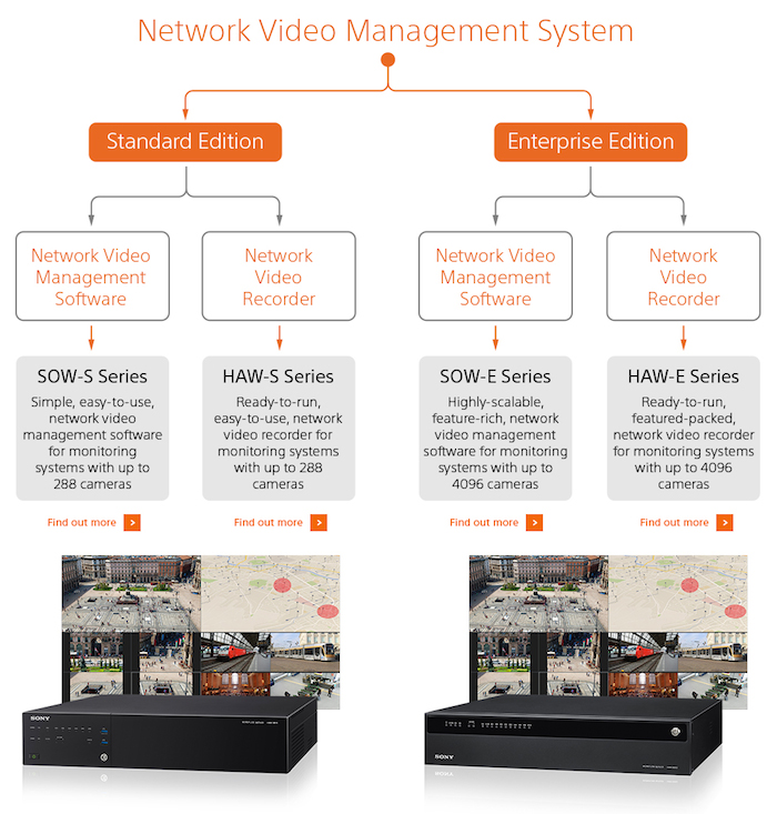ソニー ofrece en su VMS una solución flexible y personalizable para la gestión, el almacenamiento y el análisis de contenidos. Este sistema, que incluye las series HAW-E y HAW-S de grabadores de vídeo IP y las series SOW-E y SOW-S de software de gestión de vídeo basado en servidor, se ha diseñado para una amplia gama de aplicaciones de captura de vídeo comercial, como vigilancia urbana, medios de transporte, servicios financieros y educación.