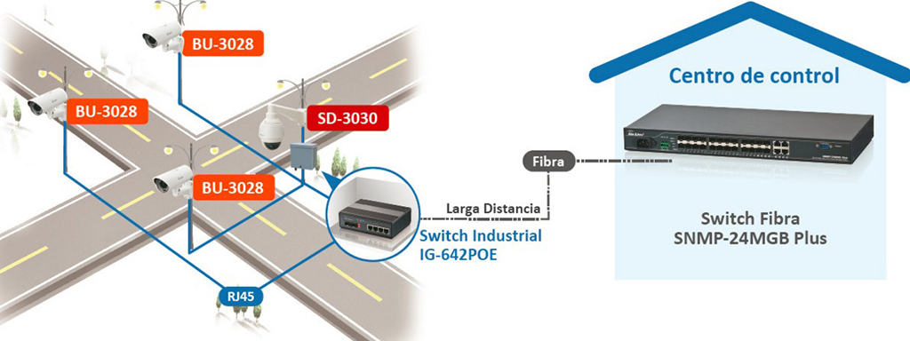 Se puede instalar el switch para fibra AirLive SNMP-24MGB Plus en el centro de control y conectarlo con el equipo industrial para exteriores IG-642POE ubicado, 例えば, en la intersección de dos calles o avenidas. Con esta configuración se puede conseguir el mayor nivel de detalle y movimientos realizados en el espacio que se monitoriza.