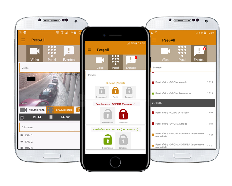 PeepAll permite el armado y desarmado del sistema de alarma, alertando de ello al usuario mediante notificaciones push en tiempo real en el smartphone. También realiza el control total del sistema de alarma (armado parcial del sistema, anulación de zonas, control de salidas programables, revisión del historial de eventos, 等).