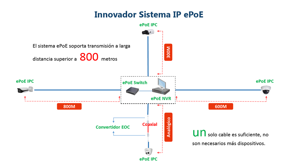 El sistema IP ePoE de Dahua presenta una configuración simplificada, con un interruptor ePoE especial y NVR. Los únicos aparatos satélite que se necesitan son el ePoE IPC en la parte final de un cable individual, unido a un convertidor EOC en ramificaciones analógicas.