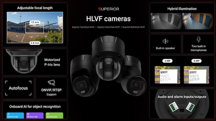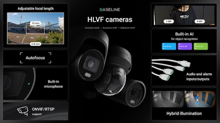 En el área de ビデオ監視, que se divide en dos líneas de productos: Baseline y Superior, Ajax ha presentado las cámaras HLVF 詐欺 objetivo varifocal motorizado y enfoque automático, que permiten un zoom flexible para captar detalles o tener una cobertura más amplia.