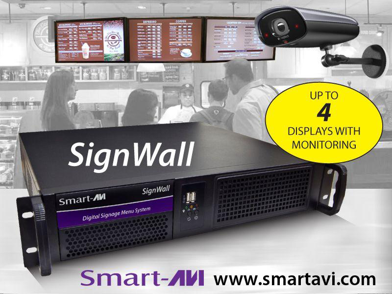 La nueva solución de SmartAVI, SignWall, permite combinar hasta 4 pantallas para formar un menú de digital signage o un vídeo wall individual. El paquete incluye el SignWatchPro, un sistema de video vigilancia para controlar el negocio mientras las pantallas están en funcionamiento.