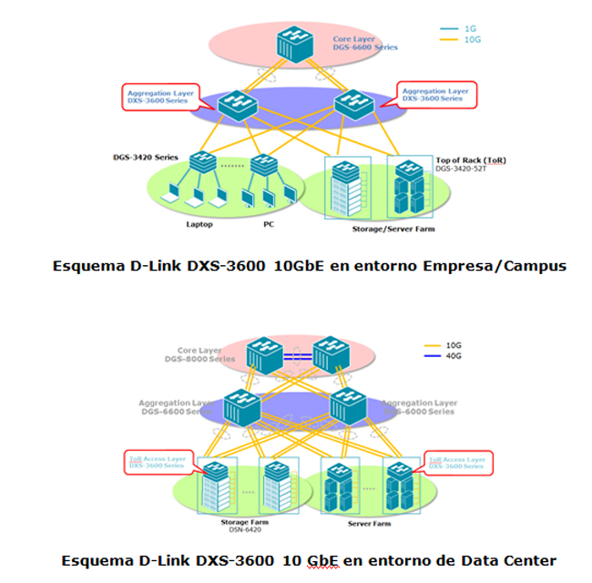 El DXS-3600 dispone de una amplia gama de prestaciones para una óptima integración de redes convergentes mediante priorización de tráfico con QoS/CoS de nivel 2/3/4 para asegurar que los servicios de voz IP, videovigilancia IP o videoconferencia disponen de la prioridad necesaria. Respecto a la seguridad, sus características incluyen multi layer Access Control List de nivel 2/3/4, 802.1X y autenticación de usuarios vía servidores TACACS+ y RADIUS. También dispone de un extenso soporte VLAN que incluye GVRP and 802.1Q VLAN para aumentar la seguridad y el rendimiento. Toda la gestión puede realizarse en remoto mediante una avanzada interfaz basada en web (Web-GUI), Telnet, SSH, SSL, o CLI. El DXS-3600 puede desplegarse en múltiples escenarios, exponemos algunos ejemplos basados en nuestra completa gama de switching y almacenamiento: