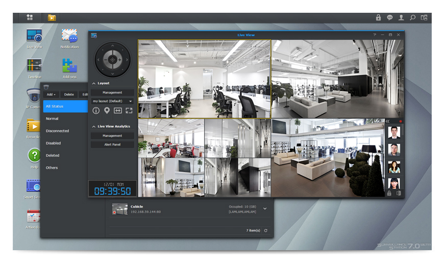 La interfaz de usuario en Surveillance Station 7.0 se ha rediseñado y reconstruido desde cero. El diseño intuitivo hace hincapié en la facilidad de uso, la multitarea y la organización práctica. Mientras que los ajustes de diseño ofrecen una experiencia más intuitiva, el nuevo Alerts Panel para Live View Analytics permite inspeccionar, reproducir y guardar eventos sospechosos de forma sencilla.