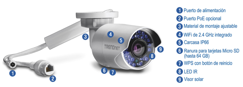Trendnet TV-IP322WI 子弹型户外监控摄像机可以连接到 WiFi 网络 2,4 GHz o PoE, 夜视距离可达 960p 视频分辨率 30 地铁, 得益于红外技术.