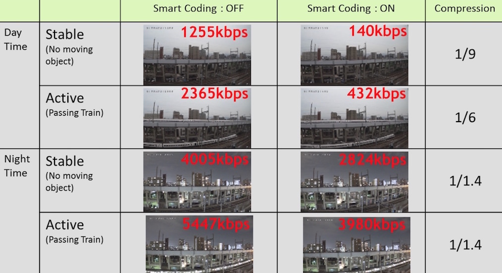 La función FDF (filtro dividido de frecuencia) se combina con la función 3D-MNR para reducir en gran medida el ruido en áreas de baja iluminación y contribuir así a rebajar la velocidad de bits de una transmisión en flujo. La tecnología de codificación inteligente de Panasonic permite reducir las necesidades de almacenamiento de datos en hasta un 70%.