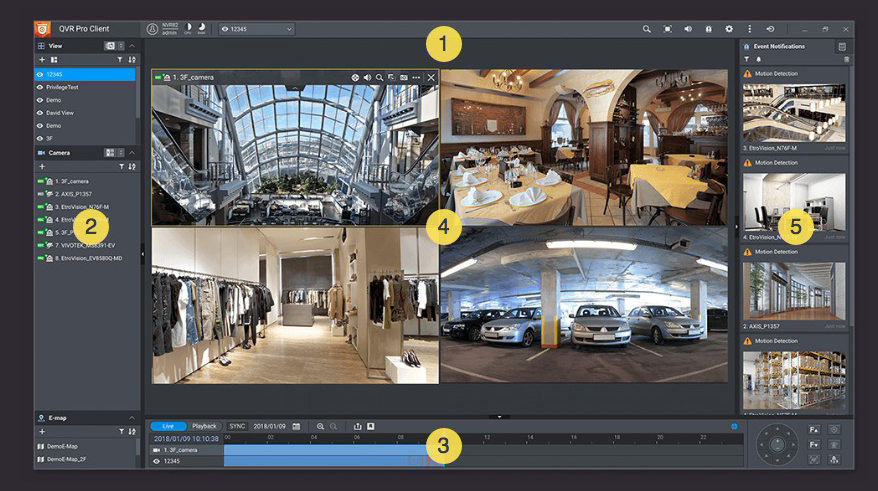 QVR Pro es compatible con un gran número de modelos de cámaras de más de 140 marcas y una gran variedad de formatos de imagen, lo que permite crear diferentes soluciones de videovigilancia adaptadas a cualquier entorno, al tiempo que proporciona una fácil gestión de las cámaras. Se pueden buscar cámaras a través de diferentes redes, agregar/administrarlas en lotes, usar equipos de 360 grados y asignar interfaces de red dedicadas.
