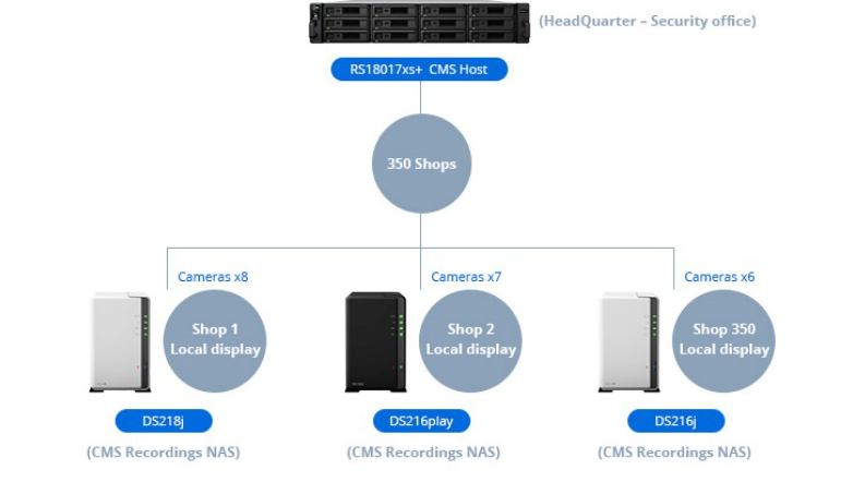 Para cumplir con los requisitos de la compañía, se optó por la tecnología de 群晖科技. Concretamente se ha utilizado una RackStation RS18017xs+ como servidor host en el CMS (Centralized Management System). Esta unidad de rack se ha instalado en la sede y recibe las transmisiones de las cámaras de sus 350 tiendas en Francia.