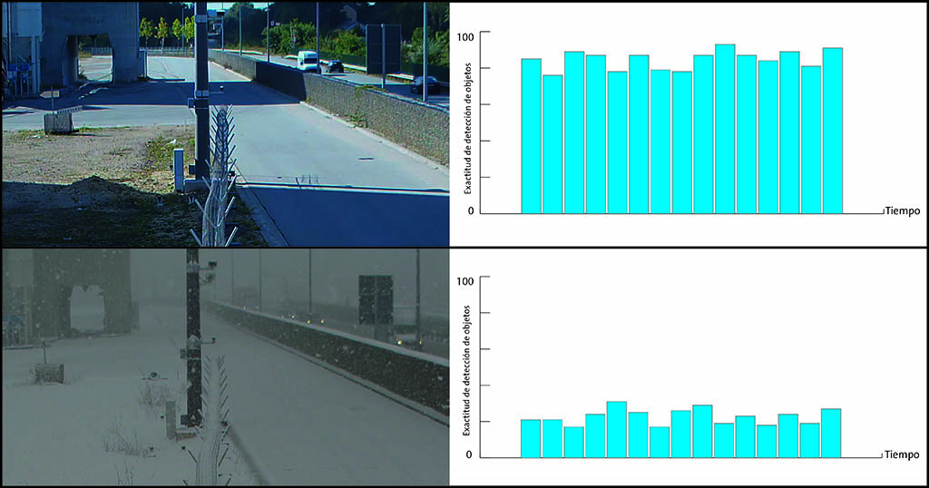 La primera pregunta, que se plantea a un usuario antes de la compra de un sistema, es la distancia máxima hasta la que los objetos pueden ser detectados, ya que influye en el número de cámaras necesarias y, 所以, en los costes del sistema entero. Pero indicar una distancia exacta no es posible. Simplemente, no existe ningún valor hasta el cual el análisis proporcione resultados 100% correctos y otro valor desde el cual una detección no es posible.
