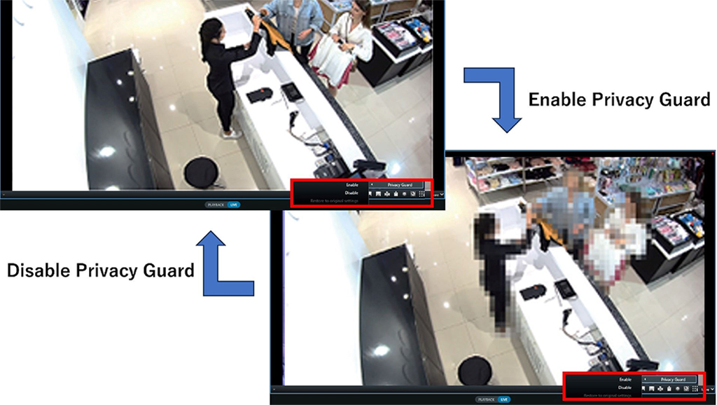 Con el control habilitado por i-PRO Maximizer, los operadores pueden eliminar la función de enmascaramiento para responder o investigar un incidente y volver a activarla según lo requieran las situaciones.
